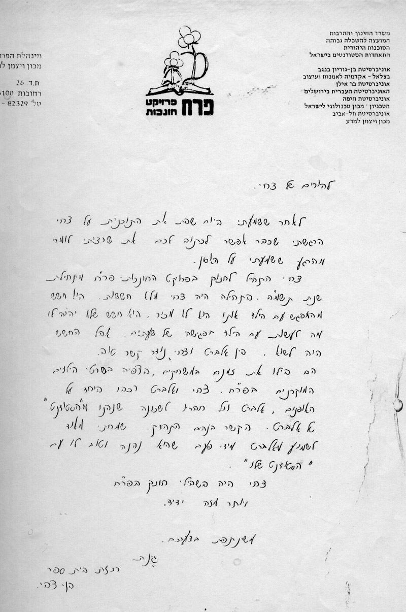 מכתב הקשור לפרויקט הגמר של צחי